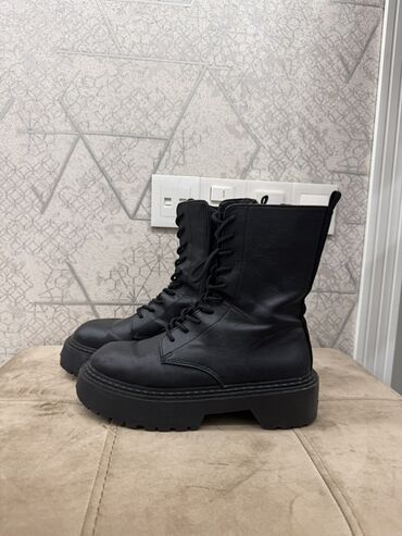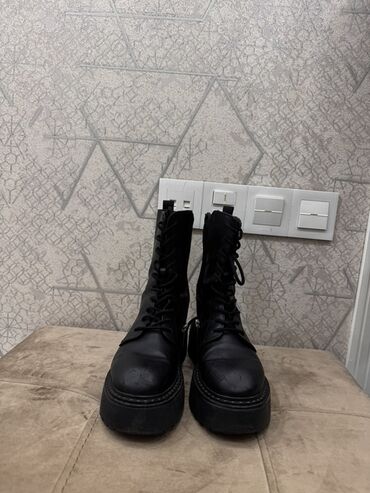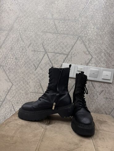 Qadınlar üçün qara rəngdə bağlamalı dərili hərbi stil çəkmələr