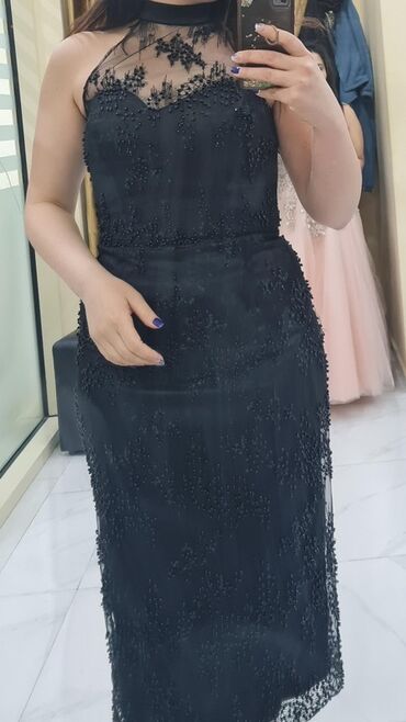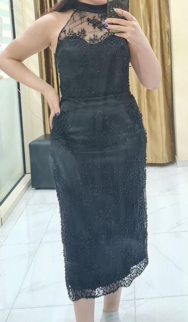 Ziyafət donu – 30 AZN - Rəng: qara - Stil: bədənə oturan, midi uzunluq - Yaxa: balıqçı tipli qapalı yaxa - Qol: qısa qol - Çiyin detalları: asma daş/sancaq bəzəkləri - Etek hissə: asimmetrik kəsim...