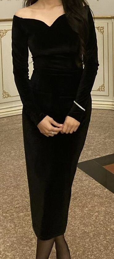 Qara məxməri gecə geyimi 1 dəfə güyinilib - Model: bir çiyin açıq, asimmetrik kəsim - Material: yumşaq məxmər, bədənə oturan siluet - Uzunluq: midi/uzun – yan hissədə yarıq - Qol: bir qolu uzun, d...