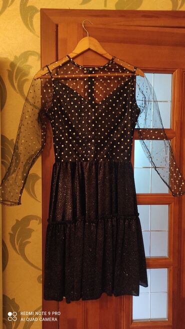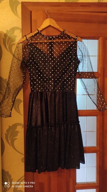 M razmer Parıltılı qara rəngdə ziyafət donu - Bədənə oturan kəsim, mini uzunluq - Yumşaq parıltılı parça, bütün hissədə xırda işıltılar - Dairəvi yaxa - Şəffaf tül qol: dirsəkdən bir az aşağı uzunl...