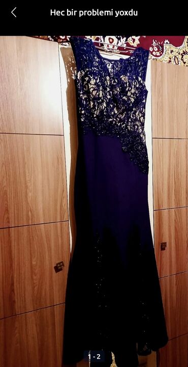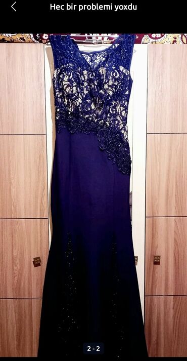 Qara axşam geyimi – uzun, zərif model 46 razmer. 44 razmerə də gedər. - Rəng: qara - Siluet: uzun, axıcı, ikiqat şifon ətək hissəsi ilə - Üst hissə: gül aplikasiyalı teksturalı dekor və xırda mun...