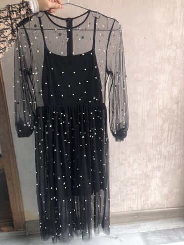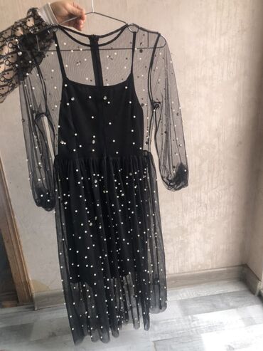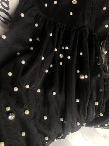 Qara rəngli qabarıq tül don - Material: incə tül qatları, içliklə - Dizayn: tam boy boyunca kaskad volanlar; tülün üzərində səpələnmiş dekorativ inci muncuqlar - Yaxa: boyunu qucaqlayan iri inci b...
