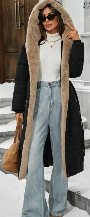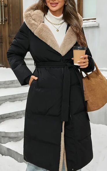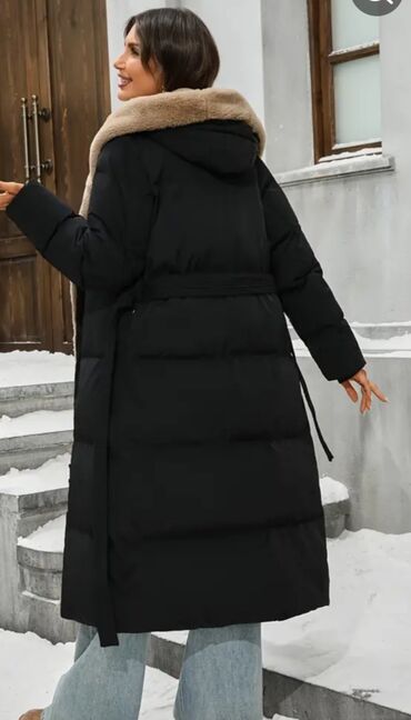 Qadınlar üçün uzun qış paltosu – kapüşonlu, kürkü imitasiya tüklü kənarla - Rəng: qara - Model: diz altı uzunluqda, puff/“duxovik” tipli - Ön hissə: iki tərəfli fermuar (aşağıdan-yuxarıdan açılır) ...
