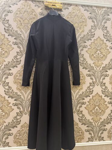 Qara rəngli, uzunqol uzun paltar. Düz kəsim, bel hissəsində yığma