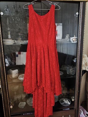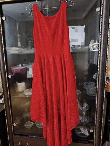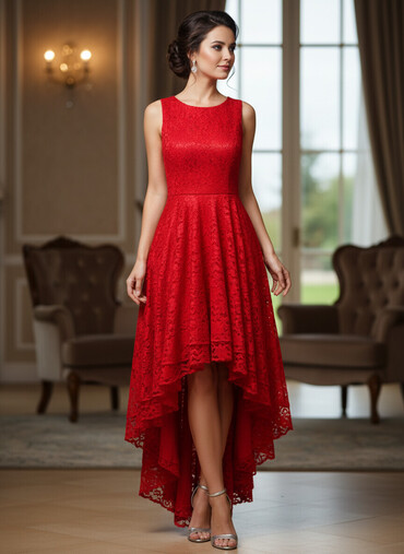 Qırmızı krujeva (məxməri naxışlı) ziyafət paltarı - Model: asimmetrik