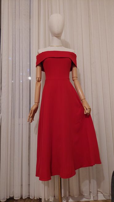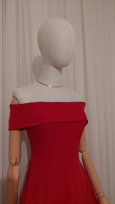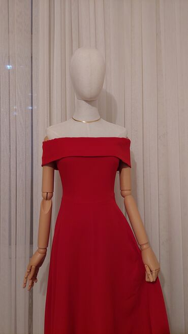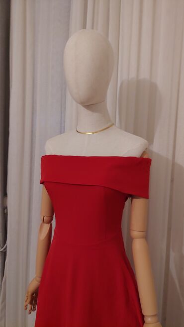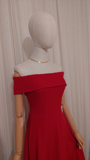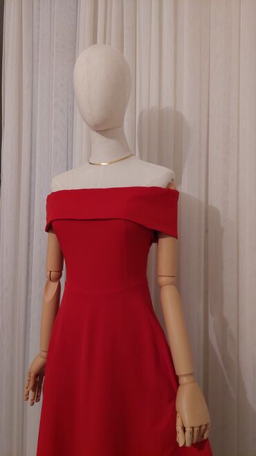 Qırmızı uzun ziyafət/libas - Rəng: canlı qırmızı - Model: açıq çiyinli, balon ətəkli və ayrıla bilən balon qollar - Üst hissə: korsetvari qatlanmış büst, bel xəttini vurğulayan konstruksiya - Etek...