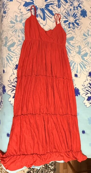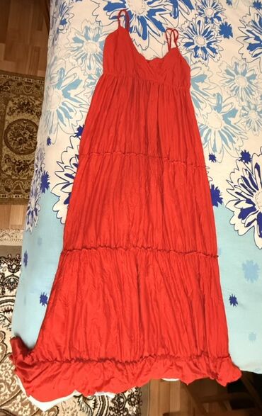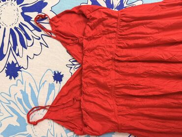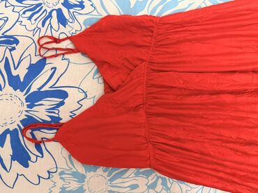 Qırmızı maxi don - Model: qat-qat ətəkli, maxi uzunluq - Rəng: parlaq qırmızı - Üst hissə: elastik smock (şirəli) büzməli korpus – bədənə rahat oturur - Yaxa: kvadrat formalı - Qol: qısa, yüngül p...