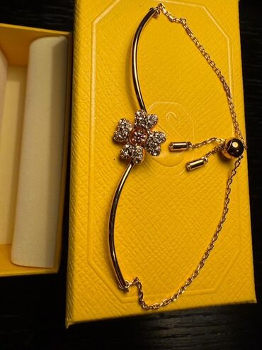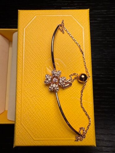 - Material görünüşü: Qızılı tonlu metal, kristal/parlaq daşlarla bəzədilmiş çiçək.