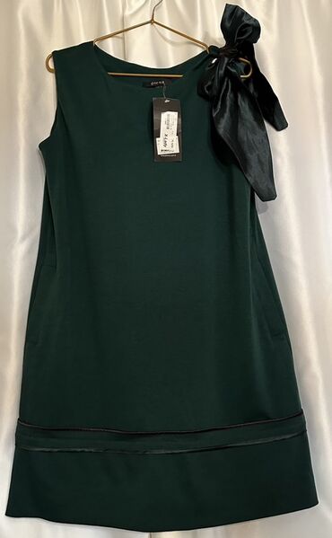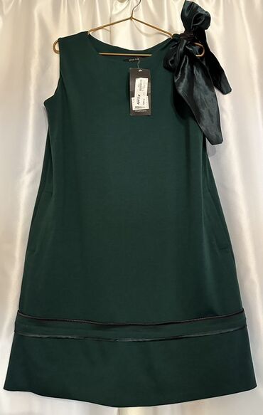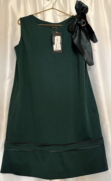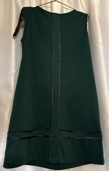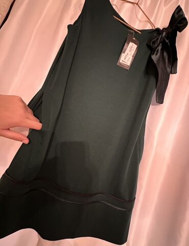Tünd yaşıl rəngdə mini/midi uzunluqda qadın donu. - Yumşaq toxumalı, azacıq teksturalı parça - Sadə, dairəvi yaxa - Geniş qısa qol - Yanlarda rahat ciblər - Arxada gizli fermuar - Parlaq qara, sün...