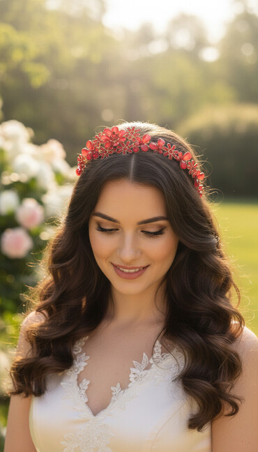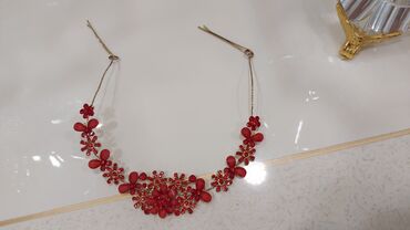 Qırmızı kristal bəzəkli saç halqası (tac) - Rəng: Qırmızı; çoxrəngli parlaq kristal muncuqlarla - Karkas: Qara rəngli möhkəm çərçivə - Dizayn: Halqanın üzərinə sıx şəkildə işləmiş kristal muncuq z...