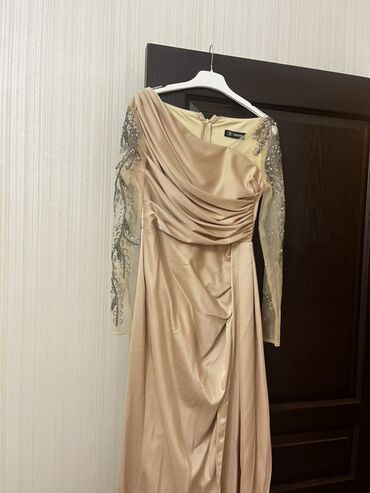 Zərif abiye don - Rəng: şampan/bej tonları - Parça: axıcı atlas-satin, bədənə oturan və düşümlü faktura - Dizayn: ön hissədə drapirovka və asimmetrik qatlar, ətəkdə yüngül yarıq - Üst hissə: bir ...