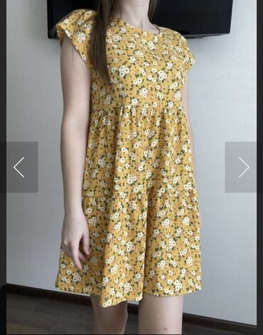 Sarı rəngli, çiçək naxışlı qısa don. Geniş yubka hissəsi və qısa qolları var. Arxa tərəfində açıq kəsim və bağlama detalları ilə dizayn edilmişdir. Yüngül və rahat materialdan hazırlanıb, gündəlik istifadə üçün uyğundur.