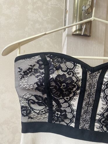 Strapless dizaynı ilə qara krujeva detallı və ağ rəngli mini don. Korset üslubunda yuxarı hissə, dəstəksiz geyinmək üçün mükəmməldir. Hər hansı xüsusi tədbir və ya gecə gəzintisi üçün uyğun olan bu don, zərif və gözəl görünüş təqdim edir.