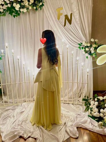 Ziyafət geyimidir 150 azn alınıb 1 dəfə geyinilib 60 azn satılır 36 ölçüyə uyğundur. Zerif sarı rəngdə uzun ziyafət/libas - Model: V-yaxa, qolçusuz - Material: axıcı şifon tül üst qat, içlikli - ...