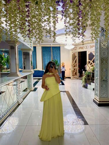 Zərif axşam/ziyafət geyimi – açıq pastel-sarı rəngdə, strapless (askısız) model. Bir dəfə geyinilib. Uzun, axıcı kəsim fiquru vizual uzadır və eleqant siluet yaradır. Yuxarı hissə bədənə oturan, aş...