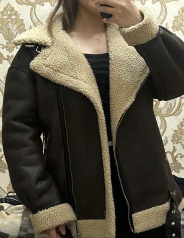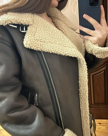 ZARA qadin üçün qışlıq “aviator” üslublu dərili kürk gödəkçə. - Rəng: tünd qəhvəyi (xarici hissə), krem rəngli süni kürk astar - Material: dərimsi üst qat, içi və yaxası qalın sherpa/kürk astarlı...