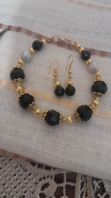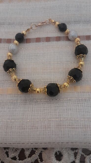 - Qara və qızılı klassik model: Fasetli qara muncuqlar, qızılı rəngli dekorativ kapsullar və ara hissələr, iki ədəd boz/boz-inci tipli muncuq vurğusu. Zərif metal qapanma ilə.