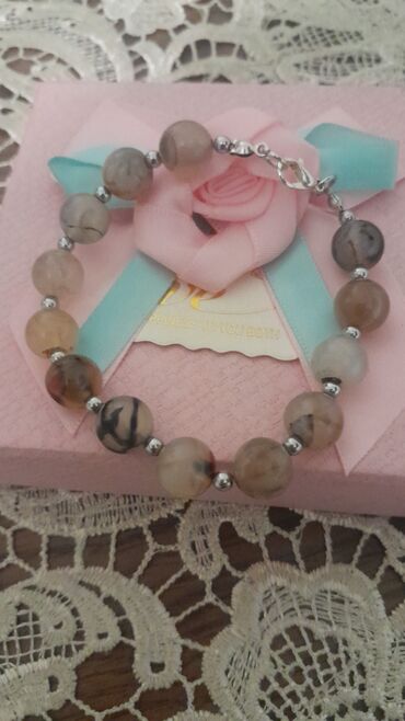 - Aqate tonlarında yuvarlaq muncuqlu model: Şəffaf-bej və boz naxışlı daş muncuqlar, aralarında metal ara hissələr. Metal karabiner qapanma.