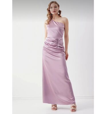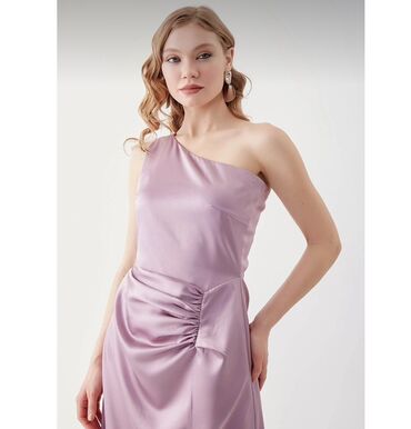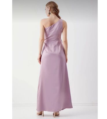 Zərif tək çiyinli uzun don – açıq bənövşəyi (lavanda) rəngdə saten parıltılı tekstura.