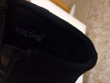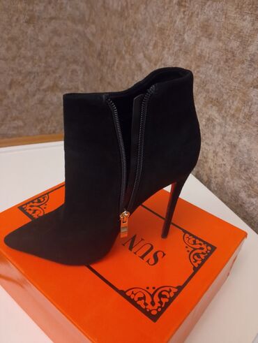 Süni süetdən hazırlanmış, qara rəngli, qadınlar üçün zərif topuqlu botlar. Botlar dəbli sivri burun və qızılı rəngli fermuarla tamamlanır. Ayaq biləyi hündürlüyündə olan bu botlar asanlıqla geyinmək üçün tərəfdə fermuara malikdir. Nazik daban incə və qəşəng görünüş təmin edir. Bu zərif botlar müxtəlif geyimlərlə uyğunlaşaraq istənilən tədbir üçün mükəmməldir. "Sun Lover" markası altında təqdim olunur.