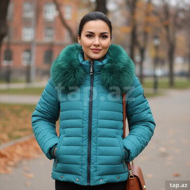 Qadın qış gödəkçəsi - Rəng: firuzə/mavi-yaşıl ton - Model: qısa, quilted (şişmə) dizayn - Bağlanma: ön tərəfdə tam fermuar - Yaxa: iri, tüklü xəz yaxa (eyni rəngdə), boynu tam ördürür - Ci...