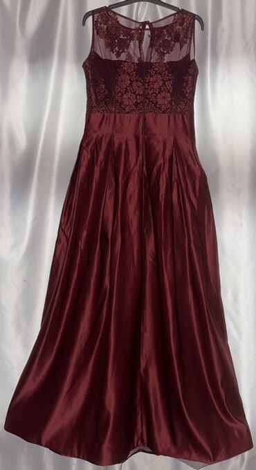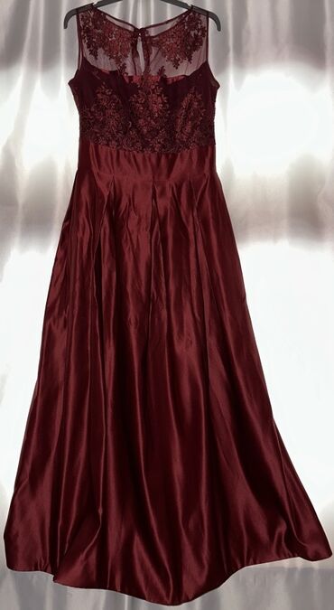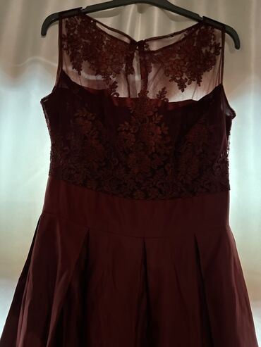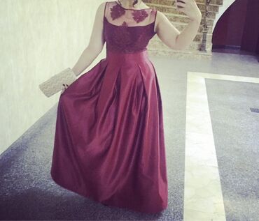 Bordo rəngdə, uzun qollu ziyafət donu. Üzərində krujeva və biserlərlə işləmələr var. Yuxarı hissəsi saçaqlı dizaynla tamamlanır. Yenidir, etiket üzərindədir. 300 azn alınıb 100 satılır. S ölçü . X...