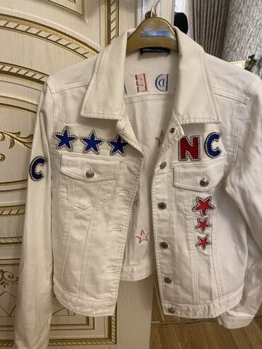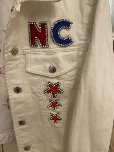 Nice Connection ağ denim gödəkçə - Material: sıx denim (pambıq əsaslı), klassik cins gödəkçə kəsimi - Rəng: ağ - Bəzəklər: mavi və qırmızı rəngli aplikasiyalar, kristal/daş çərçivəli hərflər və ul...