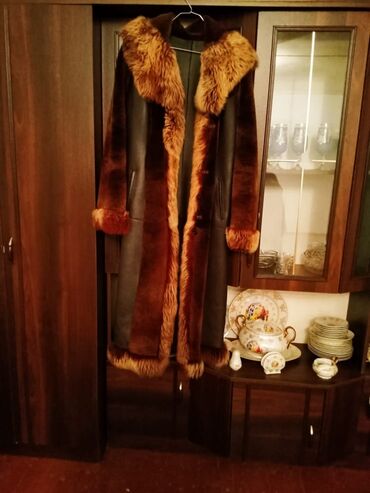 Qadınlar üçün isti dərili/kürklü üst geyimi - Material: təbii dərini xatırladan üst qat, içi tam kürklə örtülü - Rəng: tünd qəhvəyi (içi və bəzəkləri açıq qəhvəyi/taba) - Model: beldən azca yığma,...