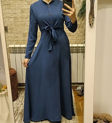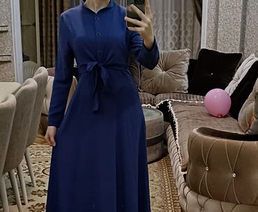 Qadın paltarı – tünd lacivərt rəngdə, zərif naxışlı parça. - Model: uzun, düz kəsim, dizdən aşağı uzunluq - Yaxa: qapalı (crew-neck) - Qol: uzun qol, manjet hissəsi yığılmış - Arxa hissə: damla-kəs...