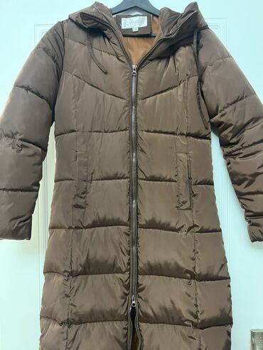Qadınlar üçün qışlıq uzun pufik palto - Rəng: tünd bej/qəhvəyi - Model: uzun, düz kəsim; arxada “V” və şevron tipli kapitone tikişlər - Kapüşon: iri, tam örtülü - Qol: uzun, aşağı hissədə elastik ...