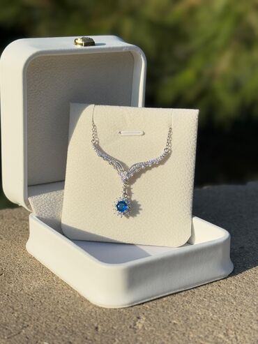 - Rənglər: Gümüş tonlu metal, mavi mərkəzi daş və şəffaf aksent daşlar.