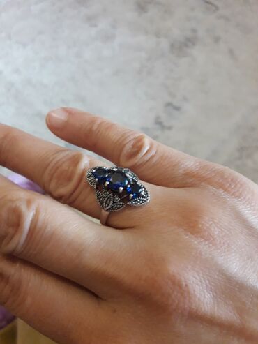 - Vintaj İngiltərə istehsal qadin zerif uzuk 925 prob Mərkəzində dərin sapfir rəngdə oval kaboşon kəsimli qaş - Mərkəzi daşı əhatə edən iki qatlı parlaqlıq: dairəvi qaşlar və üst-altar hissədə b...