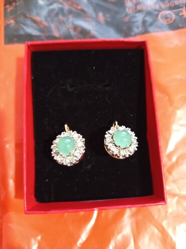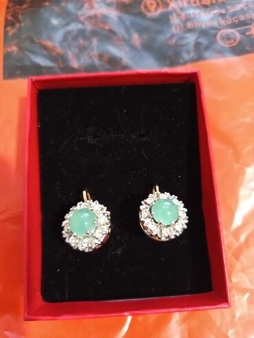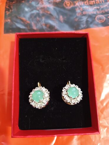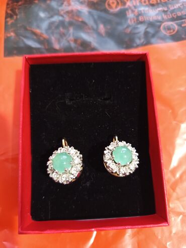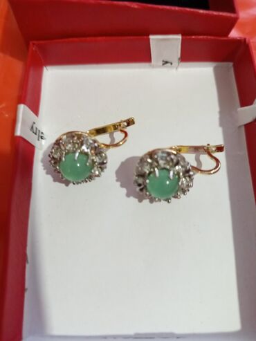 Zərif qadın sırğaları – yuvarlaq dizaynlı, ortasında açıq yaşıl rəngli daş və ətrafında parlaq şəffaf daşlardan ibarət çiçəkvari haşiyə. İki rəngli metal tonları: əsasda qızılı montaj, daşların bərkidilməsində gümüşü tonlu detallarla kontrast yaradılıb. Kilid mexanizmi – rahat qarmaq/ingilis qapanması, gündəlik və xüsusi günlər üçün təhlükəsiz istifadə imkanı verir. Klassik, diqqətçəkən görünüş; Paltar və dəstlərlə asan uyğunlaşır, üz cizgilərini işıqlandıran parıltı qatır.firuzeyi rengdedir