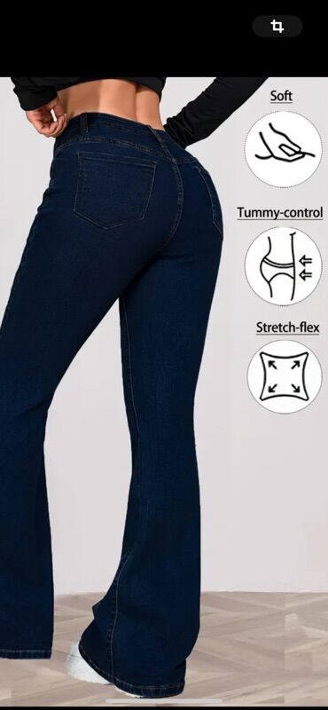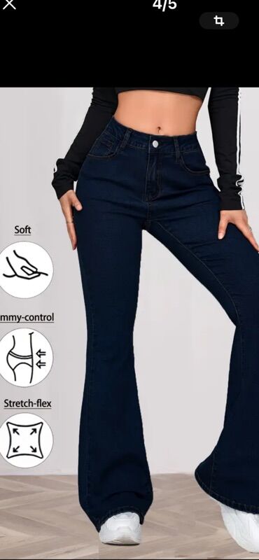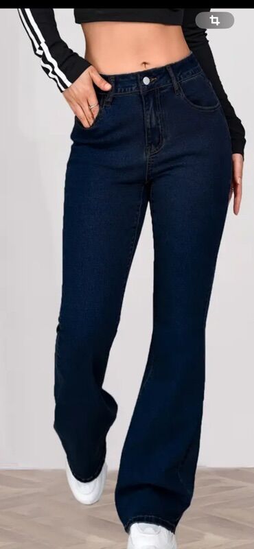 Qadınlar üçün yüksək belli, tünd-mavi rəngdə cins şalvar. - Kəsim: yuxarıdan dar, dizdən aşağı yüngül “flared/bootcut” açılan siluet - Bel: yüksək bel, bir düyməli və fermuarlı bağlama - Ciblər: ö...