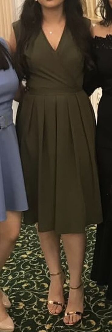 Zeytun-yaşıl rəngdə, qolsuz, A-kəsimli midi don. Üst hissə bükməli (wrap) V-yaxa dizaynla, bel xətti vurğulanmışdır. Etek hissəsi qabarıq, çoxşaxəli plisələr ilə rahat hərəkət verir. Arxa hissədə gizli fermuar bağlanması var. Axıcı, yüngül parça gündəlikdən tədbirə qədər müxtəlif kombinlər üçün uyğundur. Sandal və ya topuqlu ayaqqabı ilə şıq görünüş yaradır.