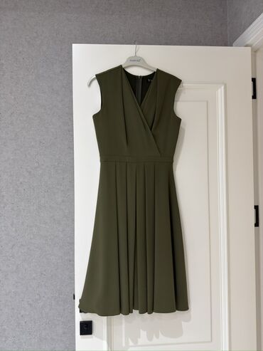 Zeytun-yaşıl rəngdə, qolsuz, A-kəsimli midi don. Üst hissə bükməli