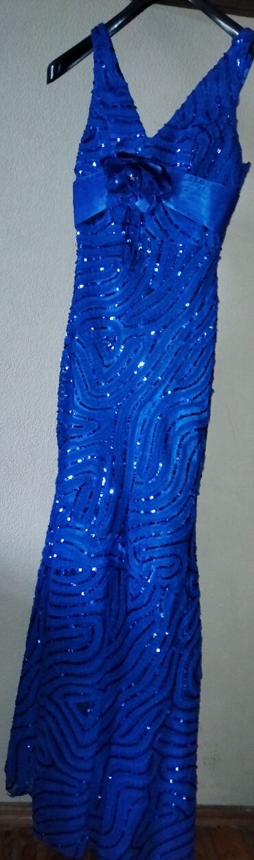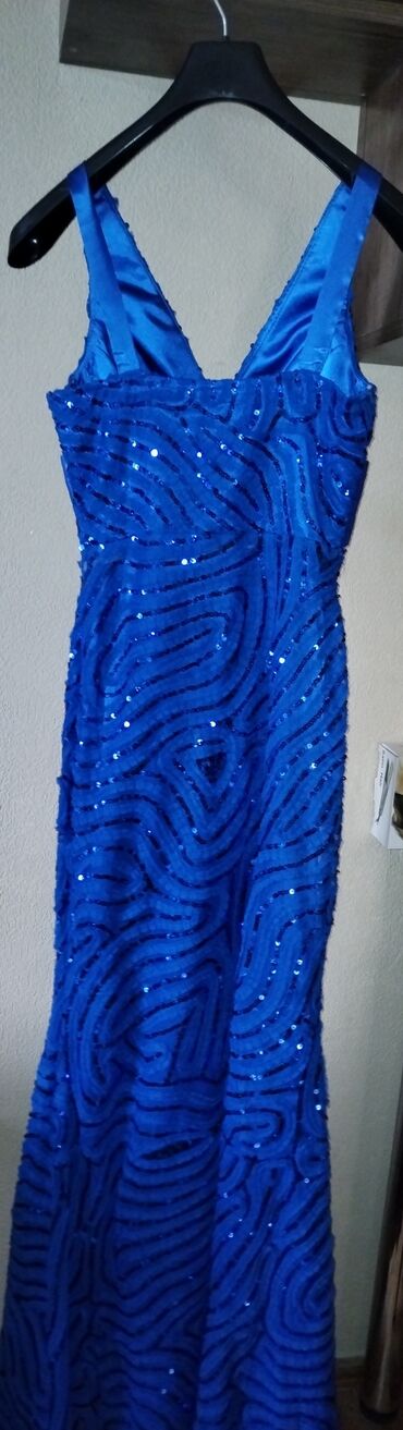 Zərif axşam/gecə geyimi – elektrik mavisi rəngdə, uzun, A-kəsim siluetli.