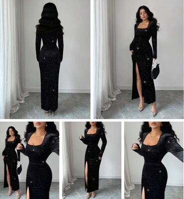 Qara axşam geyimi – zərif və eleqant - Rəng: klassik qara - Siluet: uzun, bədənə oturan maxi; ön hissədə yüngül yarıq - Yaxa: V-kəsim, üst hissədə drapirovka - Bel detalı: kristal daşlarla ulduzva...