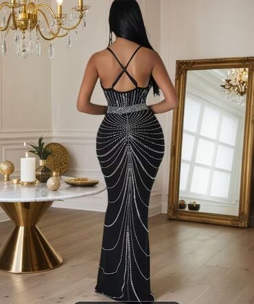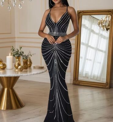 Qara rəngli, bədənə oturan, payet və muncuqlarla sıx şəkildə bəzədilmiş gecə/libas paltarı. V-yaka kəsim, qalın çiyin salları. Paltar dizdən aşağı dar formadan balıq/quyruq kəsiminə keçir və ətək h...