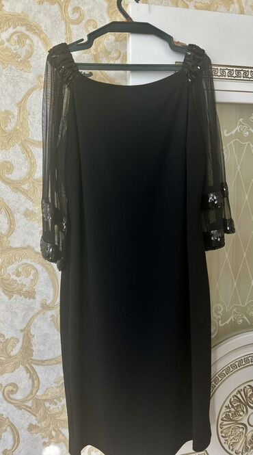 Məhsul: Qadın ziyafət geyimi - Rəng: Qara - Ölçü: XL (USA XL, MEX 42 etiketdə) - Dizayn: Asimmetrik kəsimli, bir tərəfi tam parıltılı payetli parçadan drapeli, digər tərəfi mat parça. V-yaxa, beld...