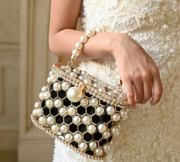 İnci bəzəkli qol çantası - Formal və dəvətnaməli tədbirlər üçün zərif aksessuar - Tam səth boyu müxtəlif ölçülü ağ inci muncuqlarla işlənib - Şaqraq qızılı rəngli sərt qol tutacağı - Qapağı metal ...