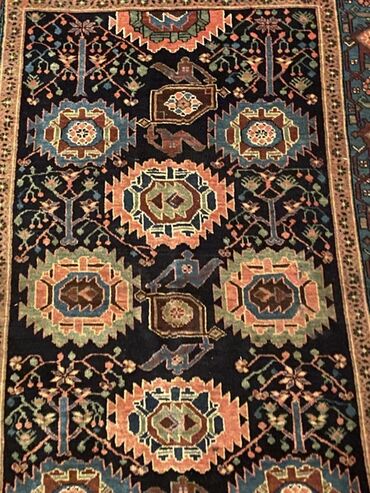 - Forma/ölçü təsviri: Uzunlamasına “qalereya” tipli xalça; mərkəzdə ardıcıl medalyonlar, ətrafda simmetrik buta və budaqlı çiçək kompozisiyaları.