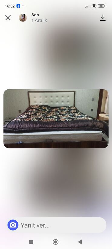 İki nəfərlik yataq dəsti - Ölçü: təxminən 140–160 sm en (şəkillərdən göründüyü kimi iki nəfərlik). - Komplekt: karkas/çarpayı, əldəki döşək, üstündən örtük. - Karkas: tünd qəhvəyi rəngdə, dekorati...