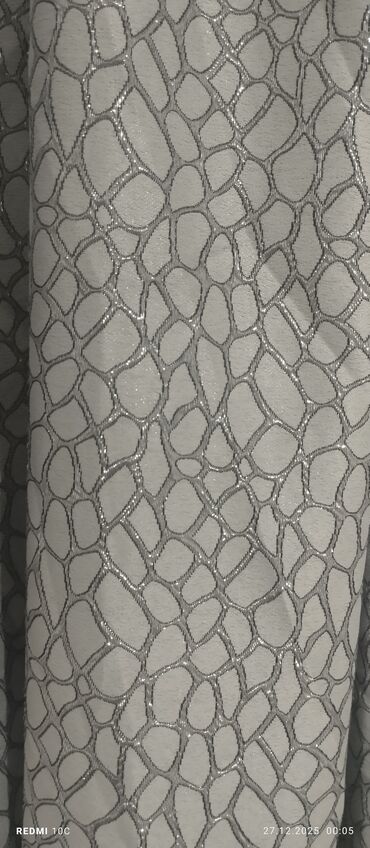 - Dekor pərdəsi: gümüşü–boz tonlarda, parıltılı ipliklərlə işlənmiş mozaika/daş naxışı.