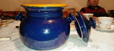 Keramika qazan – mavi şirli gövdə, sarı daxili səth və qapaq