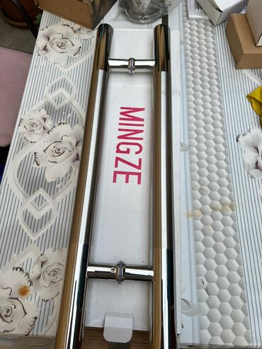 Məhsul: Metal qapı dəstı – tutacaq və üzlük komplekti - Material: paslanmayan polad/metal ərintisi, fırçalanmış səth və parlaq xrom detallı tutacaq - Komplekt: iki ədəd uzun üzlük paneli (keyhole/...