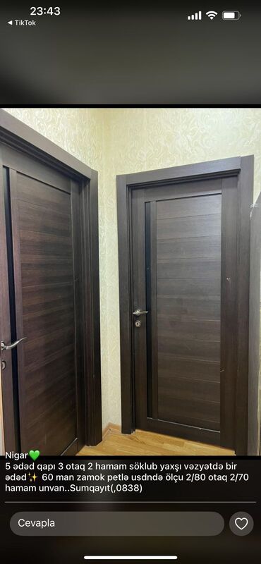 Anbardan satış.Rusiya istehsalıdı.Çərcivə ilə birlikdə eni 80 sm hündürlüyü 205 sm olan qapılardi.Qiymeti 100 manata.Qapının öz ölçüsü Eni 70 sm hündürlüyü 200 sm.Qiymətə daxildir Qapı çərçivə iki ...
