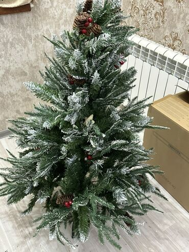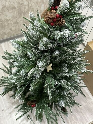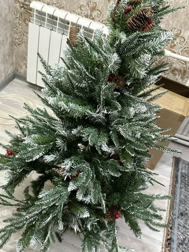 - Dekorasiya olunmuş: ağacın üzərində şam qozaları və qırmızı giləmeyvə elementləri
