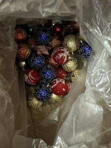 - Müxtəlif rəngli bəzək oyuncaqları (qırmızı, mavi, qızılı sferik və fiqurlu dekorlar – şəkillərdə göstərilib)