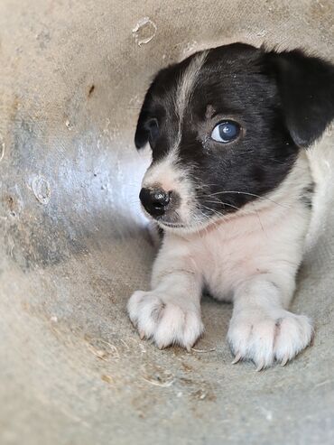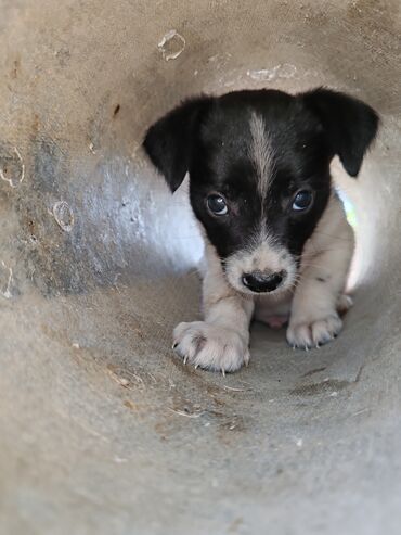 Qara-ağ rəngli it balası - Növ: it balası - Rəng: qara-ağ, sinə və pəncələrdə ağ ləkələr - Yaş: şəkillərdə yeni doğulmuş/çox balaca - Xüsusiyyətlər: sakit və mehriban, insan əlini iyləyib yaxınlaş...